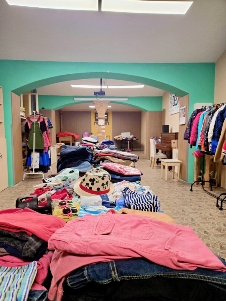 V klubovně bylo rozmístění následující: zadní část Neobyčejné klubovny obsahovala na pingpongových stolech plyšáky, batohy, šperky a další věci. Dále byl vytvořen „had“ ze stolů, na kterých ležely knihy, sukně, halenky, svetry, kalhoty, trička, nátělníky – jak dětské, tak i dospělé. K dispozici jsme měly tři štendry, na kterých visely šaty, bundy a mikiny.